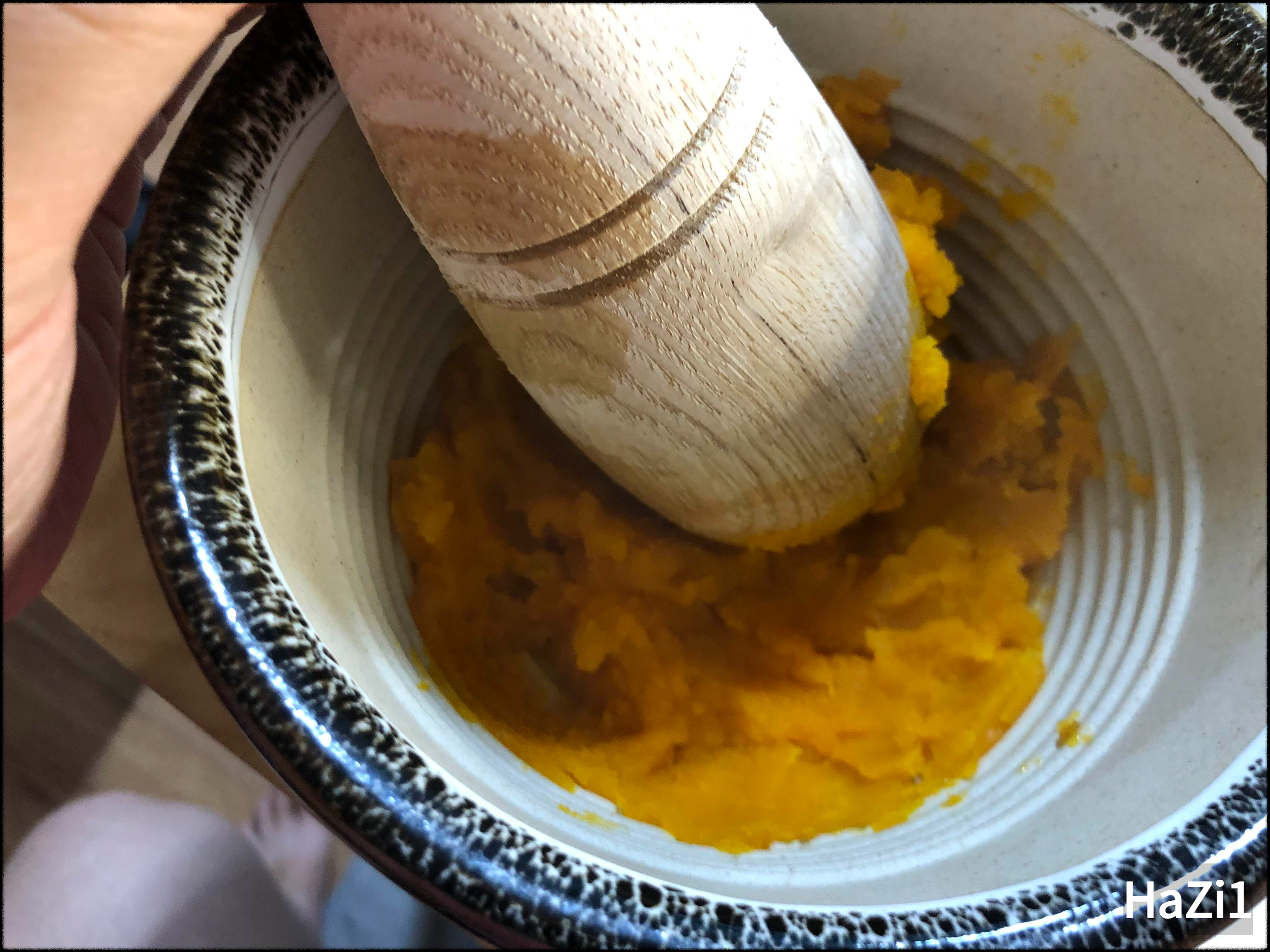 다 찐 단호박도 절구에 빻아줍니다