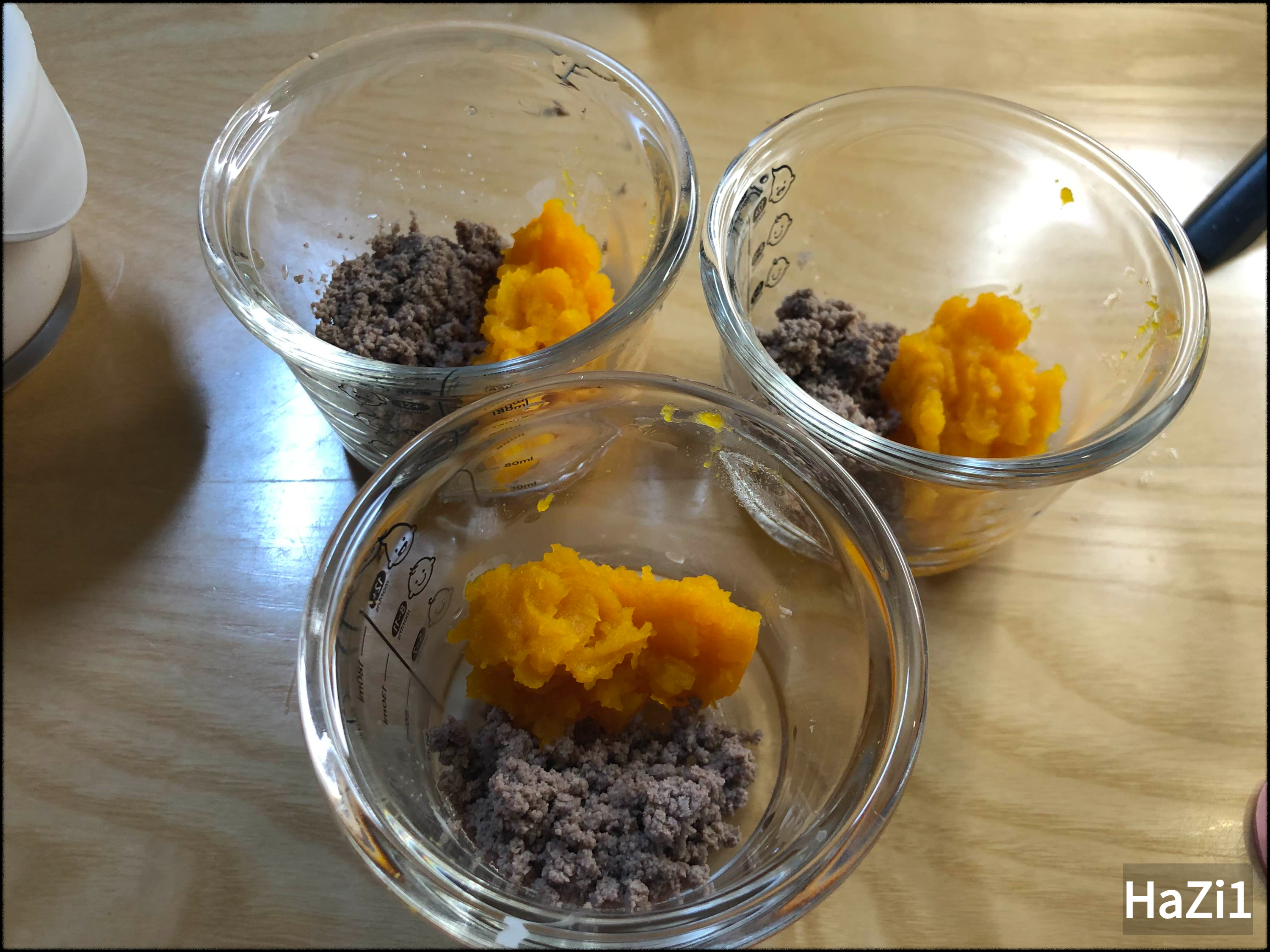 아까 곱게 빻아놓은 소고기와 단호박을 따로 담아줍니다.